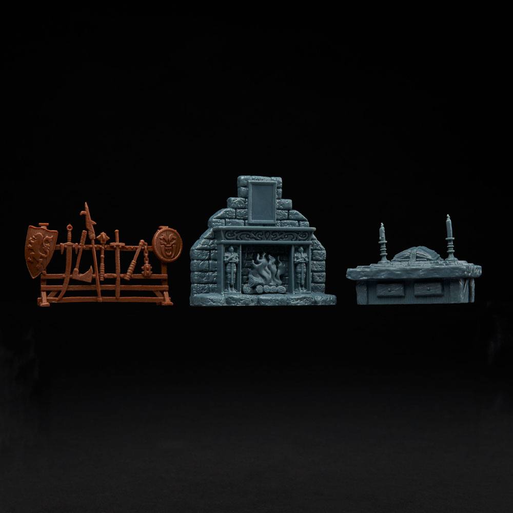 Incluye: tablero de juego, 31 miniaturas de monstruos, 4 miniaturas de héroes, 15 piezas de mobiliario, 10 piezas de calaveras, 4 piezas de ratas de plástico, 21 puertas de mazmorra, 93 cartas de juego, 4 cartas de orden de turno, fichas de cartón, Libro de Misiones, 4 cartas de personaje, pantalla del Director del Juego, bloc de hojas de personaje, 6 dados de combate blancos, 2 dados rojos y manual de reglas.