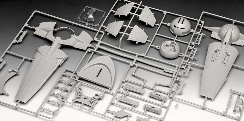 Además de los colores básicos, también se incluyen adhesivos y pinceles. Kit de modelo fácil de construir de la famosa nave de Darth Maul de Star Wars Episodio 1. Escala 1:120. 35 piezas. 221 mm de longitud. Apto a partir de 10 años.